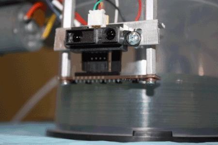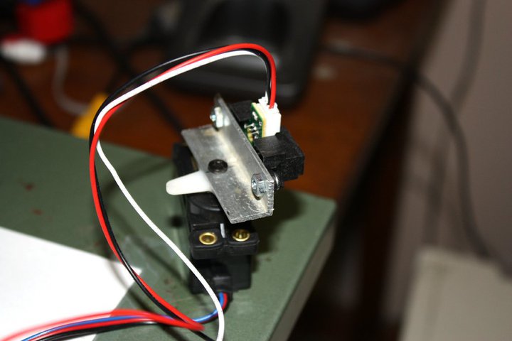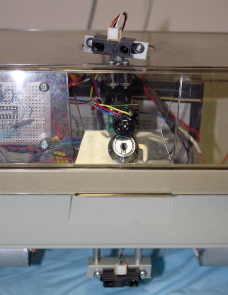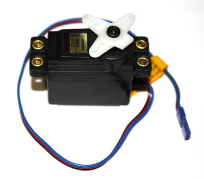 To detect a wider ranger, the top IR sensor is mounted to an RC plane servo and it sweeps back and forth. My servo was an old one I bought years ago but rarely used. It is relatively big but it makes no difference on my robot. The sweeping is controlled by software. It is super easy with a microcontroller to tell it exactly how many degrees to sweep, how wide to sweep and at what resolution. It all can be changed in seconds. Plus the sample code to do this is included free with the Arduino software environment. | ![]() |