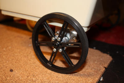 80 RPM 12 volt motors from Pololu Robotics. | Wheels mounted to hubs mounted to motors. |