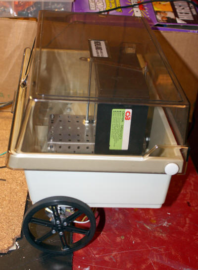 Front view show battery in place. | Underside with furniture caster for third wheel. |