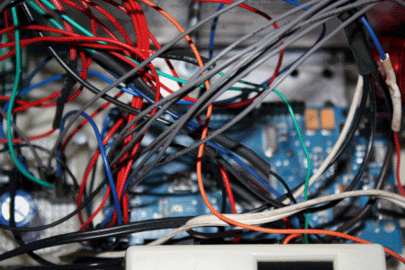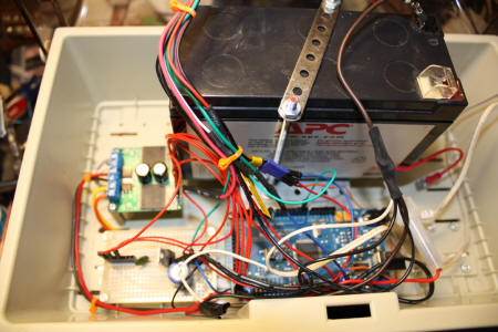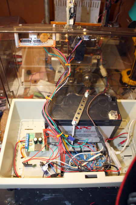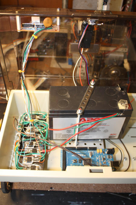 Bottom view show the sensor array, motors and idler wheel. | Rats nest of wires, yeah! |