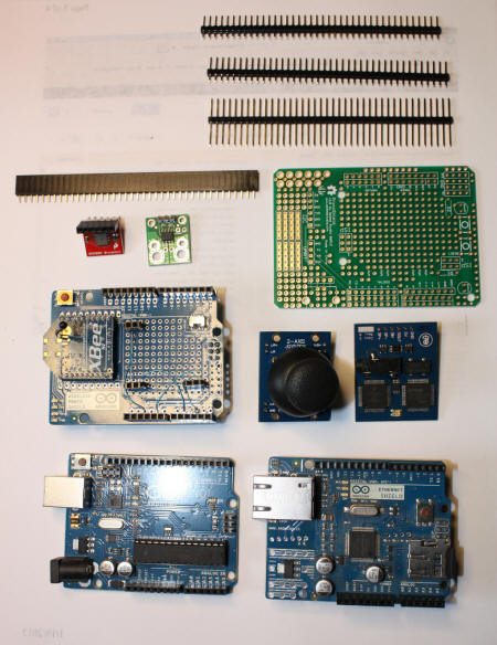 Arduino Uno, a secondary microcontroller for remote control. It will drive one of the Xbee radios. | Wireless shield which Xbee radio will sit on which will mount to Uno. |
