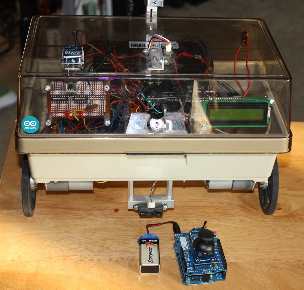 Sharp IRR mounted on servo which sweeps 110 degrees. | 80 RPM 12 volt motors from Pololu Robotics. |