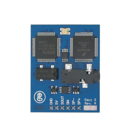 Various shields and circuits used with Arduinos. The green board is a prototype I got from Radio Shack for $10 and includes sockets, headers, switch, etc. | The Emic voice synthesizer from Parallax. You send it a text word and it speaks it. Very easy to use and sounds pretty good. |