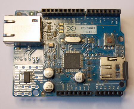 Xbee radio mounted up on the "hood". | The Ethernet shield allows for any Arduino to talk over the internet. |