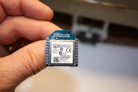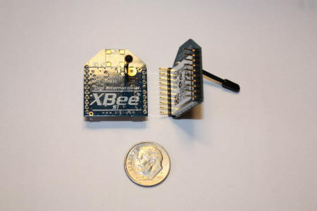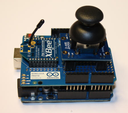 Two Xbee radios used for remote control. They operate at 2.4 ghz and have a rang of about 100' inside. | Xbee radio mounted on shield. This one is used to transmit joystick commands. |