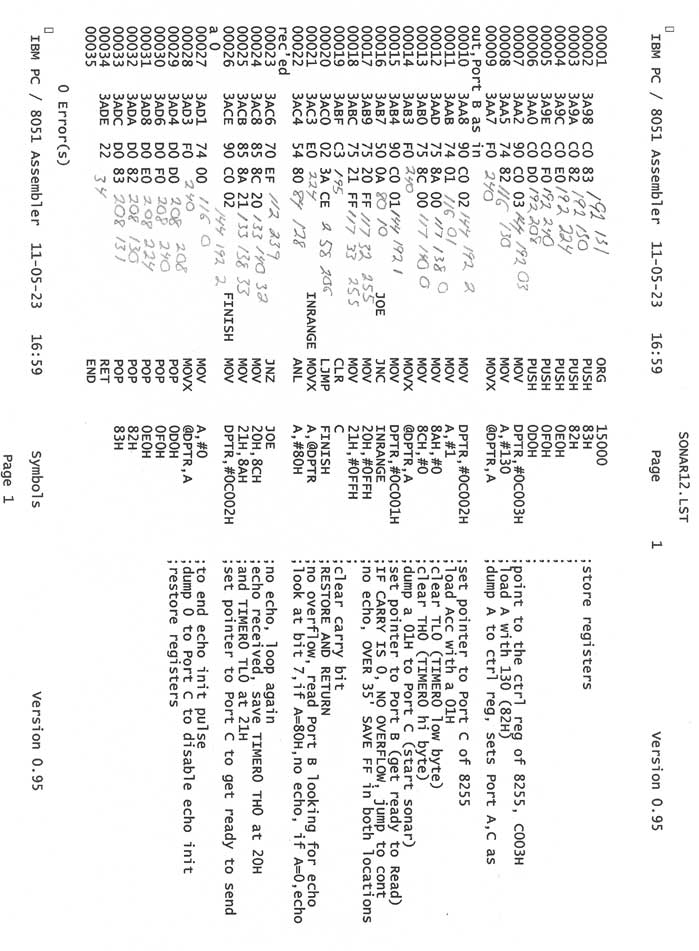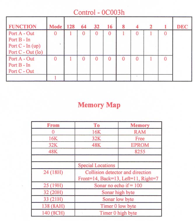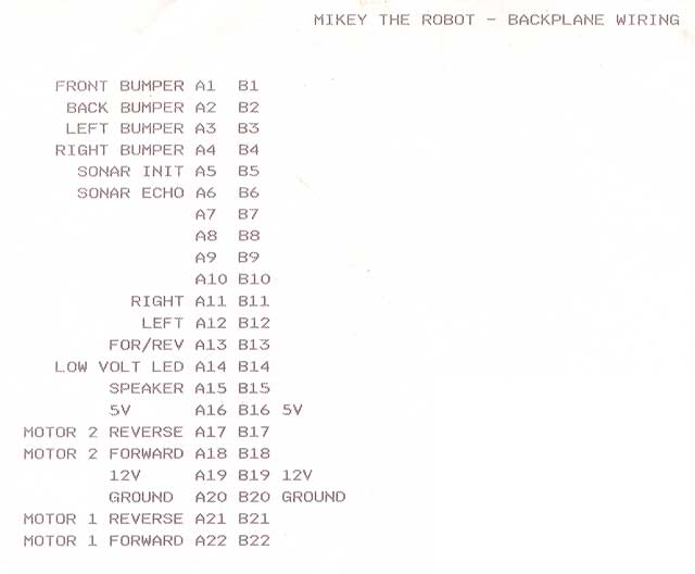 The heart of Mikey is an 8052AH computer chip which has built into a BASIC interrupter which means simply I can hook up the chip to a PC to down a BASIC program to it, disconnect the PC and off it goes. The circuit I designed is basically the same one seen many places when it comes to the 8052 chip. Basically the computer has 16K of RAM and 16K EPROM which can hold alot more code than you may think. The photos show the history of the construction. I apologize for the poor quality of of the pictures since they we digitized from old VHS video tapes 10 years old. One of the keys to building a robot from scratch is that you make do with things you find around the house and with what's in your junk box. The rest you go to the hard ware store and buy.