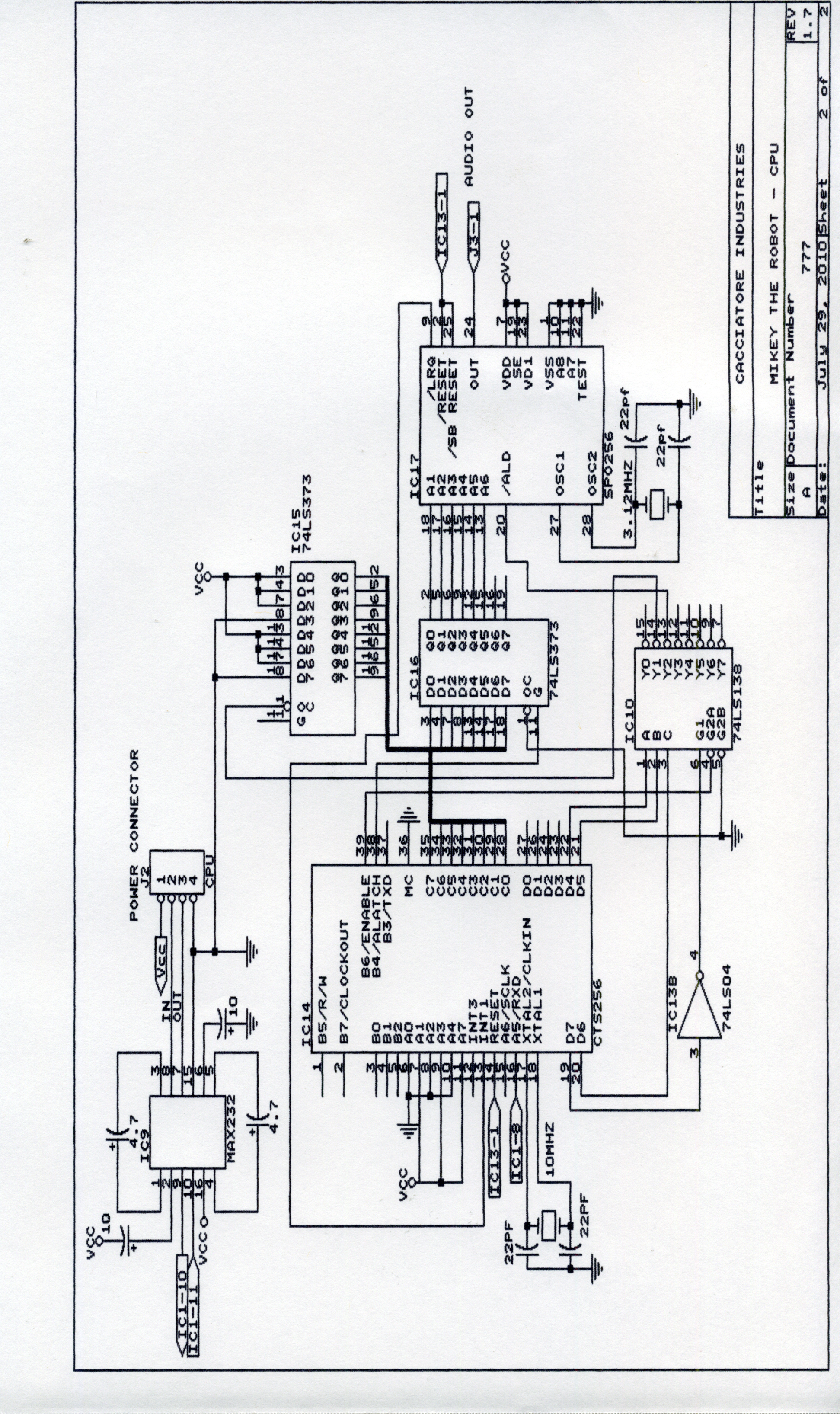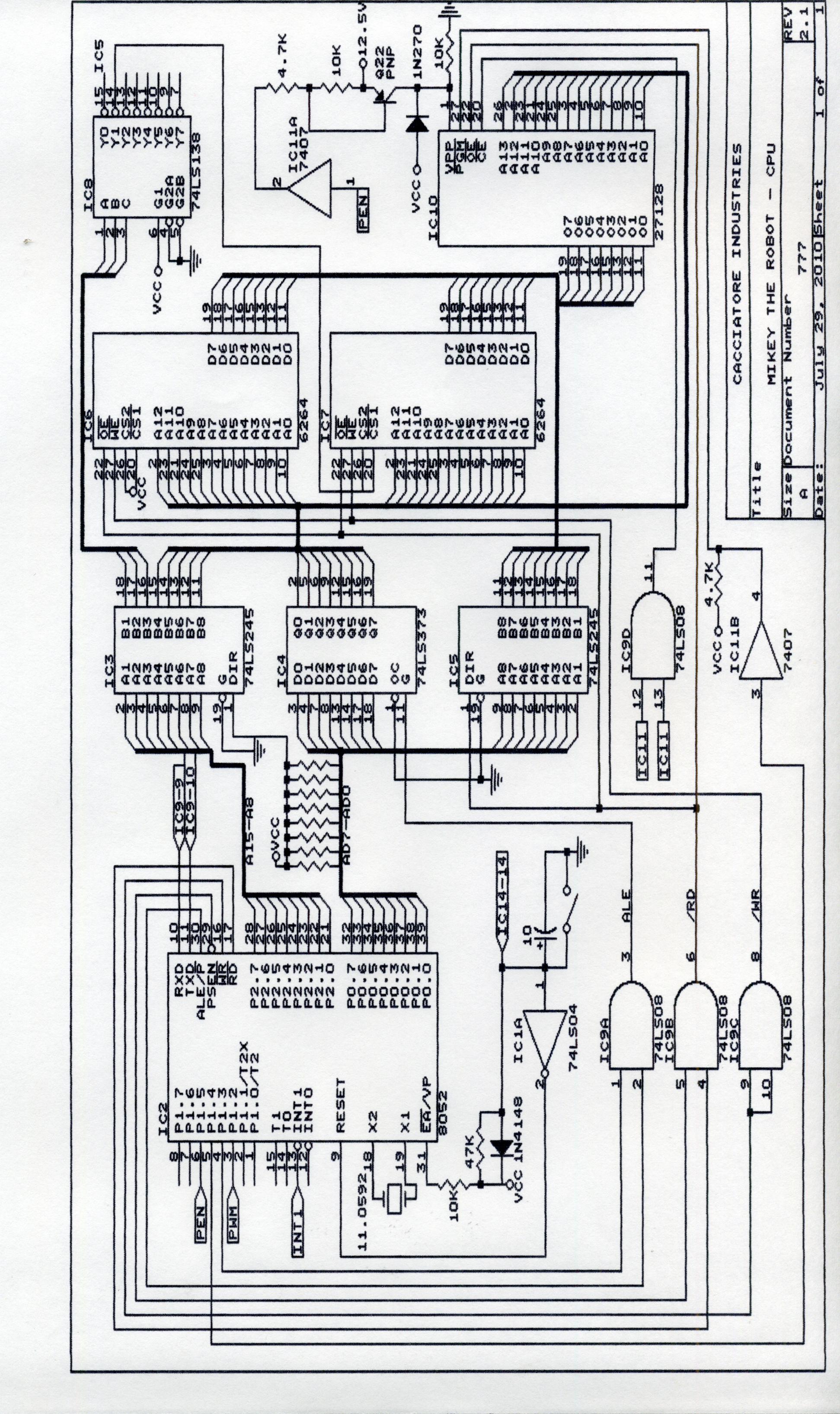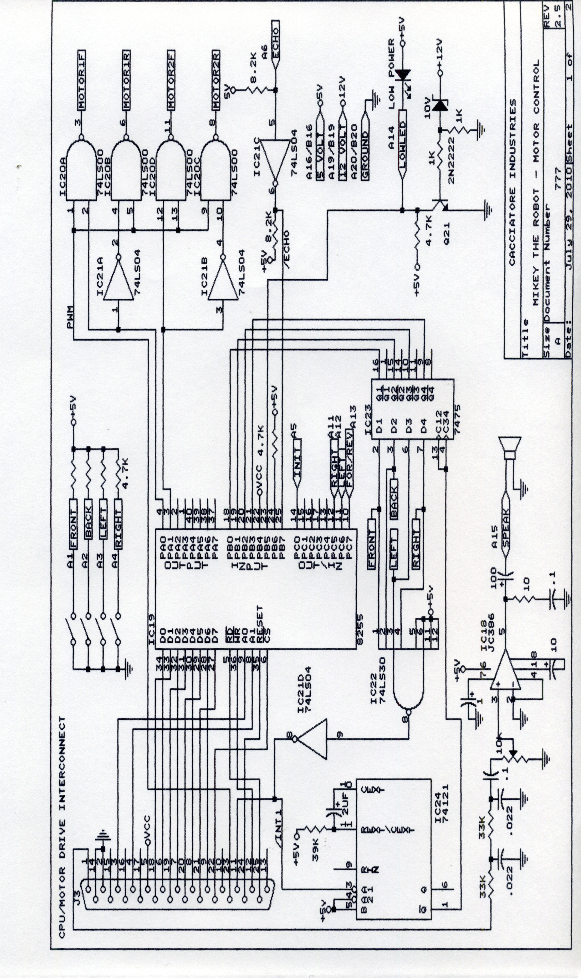 Circuit Design: The whole robot is centered around the Intel 8052AH CPU along with Radio Shack Text to Speech and Speech Processors, 8255 Interface and miscellaneous transistors and parts. Below are the schematics for the robot: