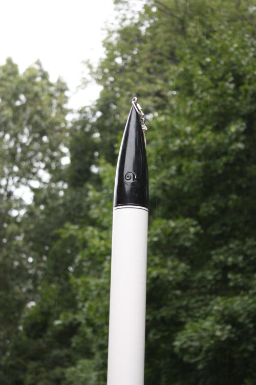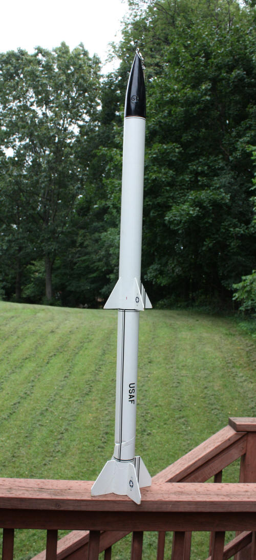 The added weight at the top helps stabilizes the rocket and has little effect on the rocket. | Rocket ready for flight. The rocket is a TLP AMRAAM dual engine model and can fly on 2 C11-3 or 2 D12-5. It has flown many times and shows signs of wear and tear. |
