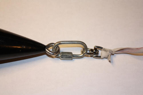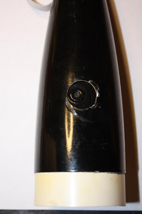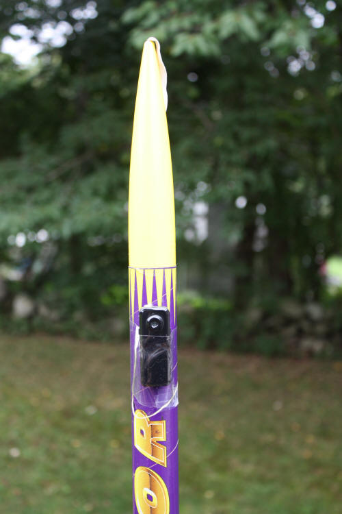 If you have seen my X10 Video page you will recognize the nosecone. I took out the X10 crap and used the same hole to mount the new camera. I use just shipping tape to fasten it into the nosecone. | One of the biggest problems with shooting video is spinning during the decent. I solved the problem by having the nosecone/camera come down on its own chute. The chute/shock cord is attached to the top of the nosecone with the swivel which allows the chute to spin but keeps the nosecone from spinning. |