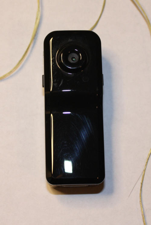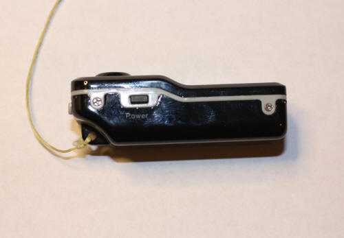 The camera is 2"x 1"x .75" and weighs .4 ozs. It uses a built-in rechargeable battery and has a USB port to download video and for power. | Side views shows the power button and Kevlar safety string attached. I attach the string to the rocket on the chance the camera breaks free from the tape during flight. |