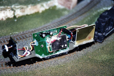 My friend Milo brought over a Trendmasters Video Camera w/transmitter and receiver that he just picked up for $20 at a discount store. Original price was like $80! It included a green camera with built-in 2.4 gighz transmitter which broadcast video AND sound up to 50' away to a receiver which plugs into a VCR or TV. He had a great idea of taking it apart and mounting it on a flatcar. We used a 50' boxcar with the shell removed. All the parts were hot glued to the boxcar in a matter of minutes. This camera is nice because it runs on a standard 9 volt battery and is pretty sensitive to light. The only problem we had is because the antenna and transmitter board is so high, it only cleared one of my tunnels and none of the bridges.