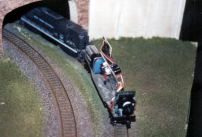 Needless to say, we went back and bought out the remaining cameras the store had (2). The next train cam was made on a 52' depressed center Bachmann flat car with 6 wheel, all steel trucks (shown above). Taking the antenna apart to remove the housing made it small enough to be mounted vertically and still clear the bridges and tunnels. We had to mount the circuit board at an angle to reduce clearance. We accomplished our goal. The car can travel under any bridge and in any tunnel now. If you click and download the videos, you'll see it go around various tracks of my layout. (You'll also see that I need to get alot more scenery added!) Although the quality isn't broadcast quality by any means, it is really cool to take a tour of your layout from your own trains!